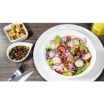 Ensalada Mix de hojas, rúcula, rábano, tomate cereza, palmito, cebolla lila y salsa balsámico